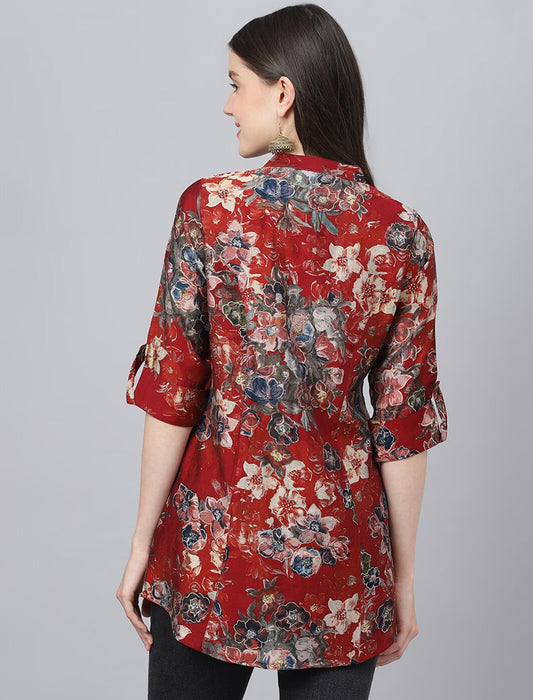 Red Women Floral Printed Mandarin Collar Roll-Up Sleeves Shirt Style Top