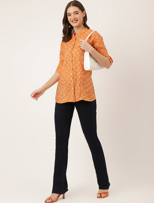 Peach Women Ethnic Motifs Printed Mandarin Collar Roll-Up Sleeves Shirt Style Top