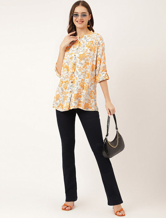 Orange Women Floral Printed Mandarin Collar Three-quarter Regular Sleeves Top