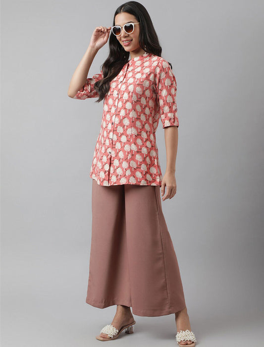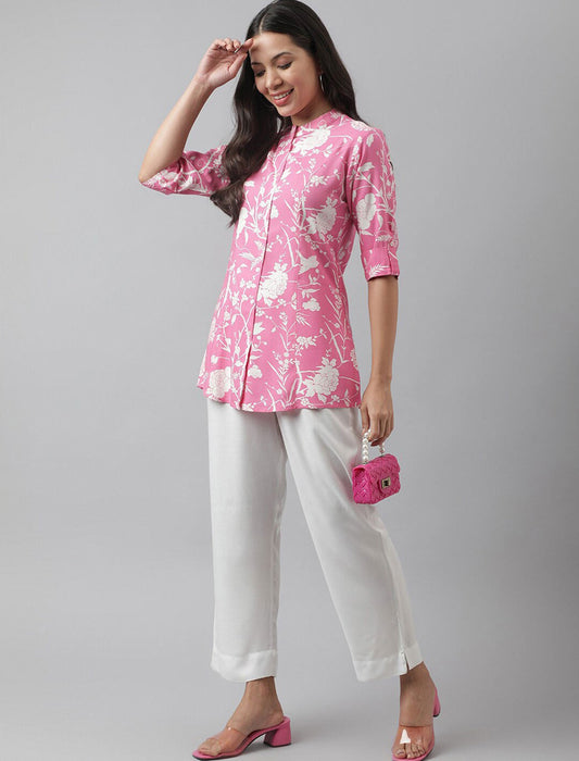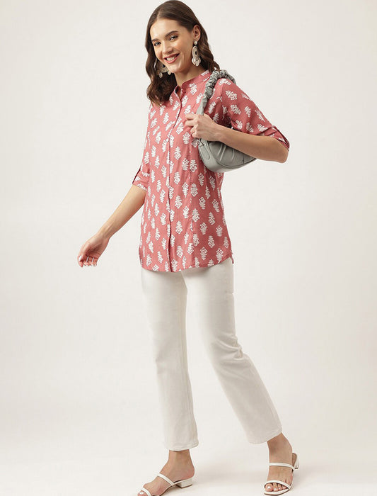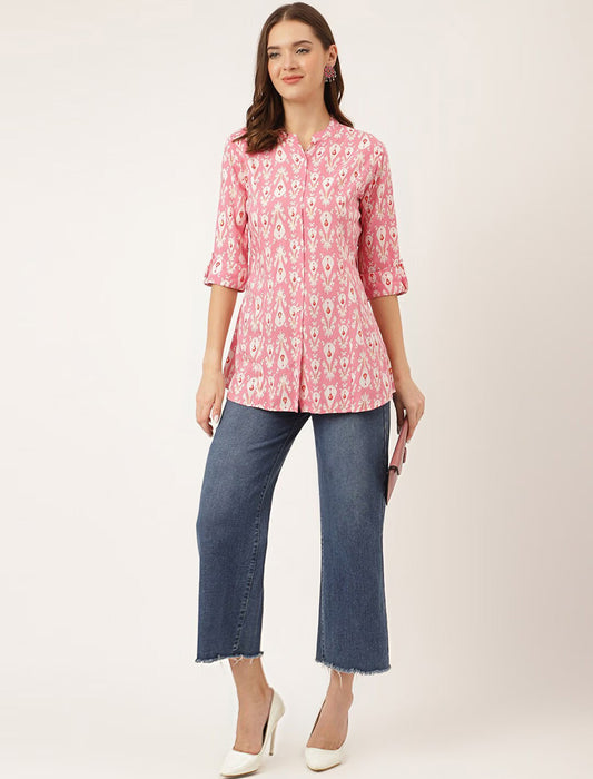 Pink Women Ethnic Motifs Printed Mandarin Collar Roll-Up Sleeves Shirt Style Longline Top