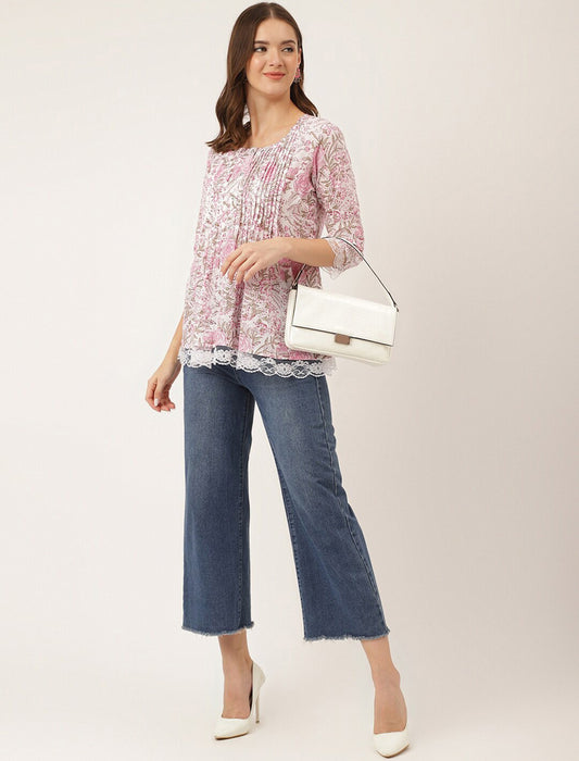 Pink Women Floral Printed Round Neck Cotton Regular Top
