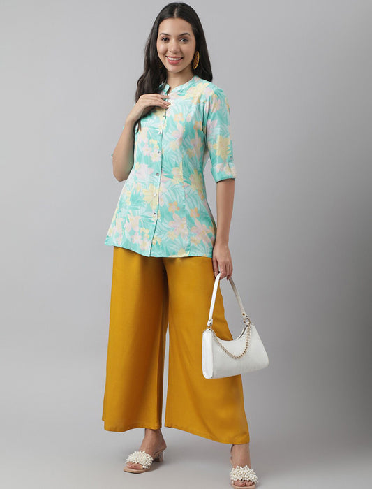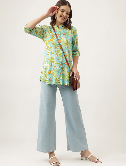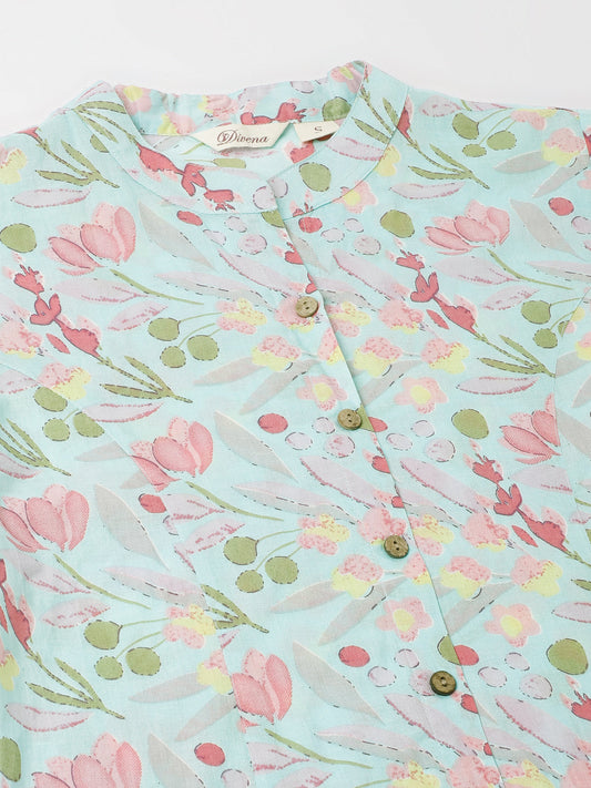 Sea Green Women Floral Print Mandarin Collar Roll-Up Sleeves A-line Shirt Style Top
