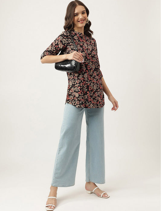 Black Floral Printed Mandarin Collar Shirt Style Viscose Rayon Top
