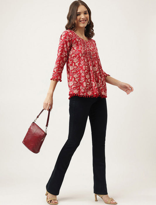 Maroon Women Floral Printed A-Line Knitted Cotton Regular Sleeves Top