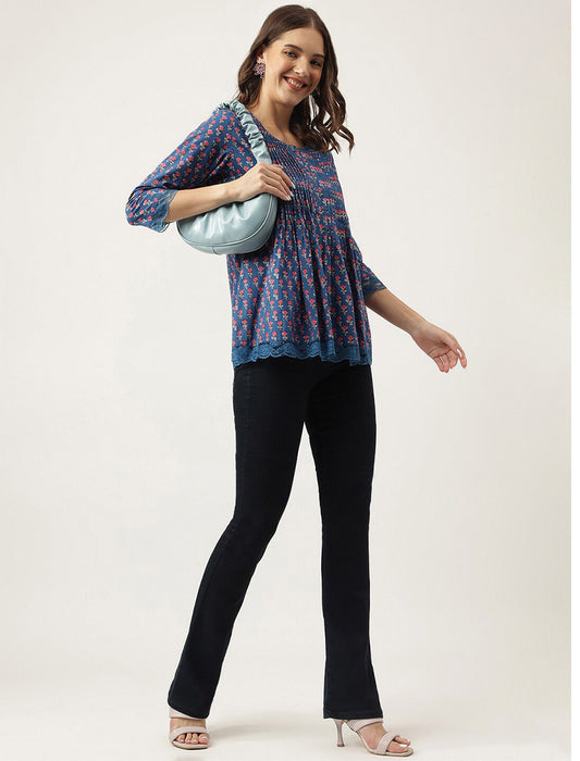 Blue Women Ethnic Motifs Printed A-Line Knitted Cotton Regular Sleeves Top