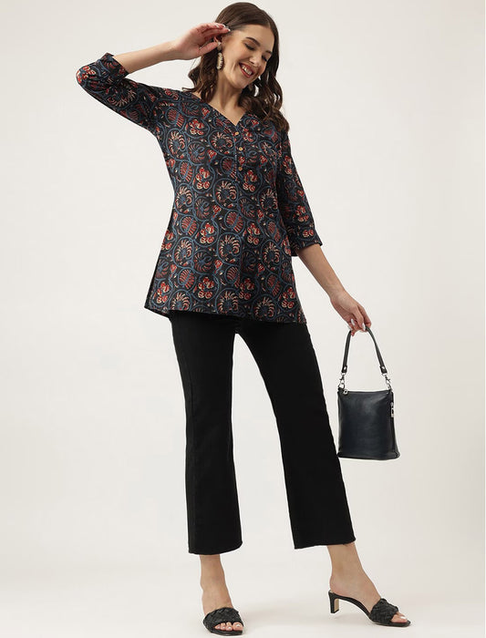 Navy Blue Women Floral Printed V-Neck Knitted cotton Top