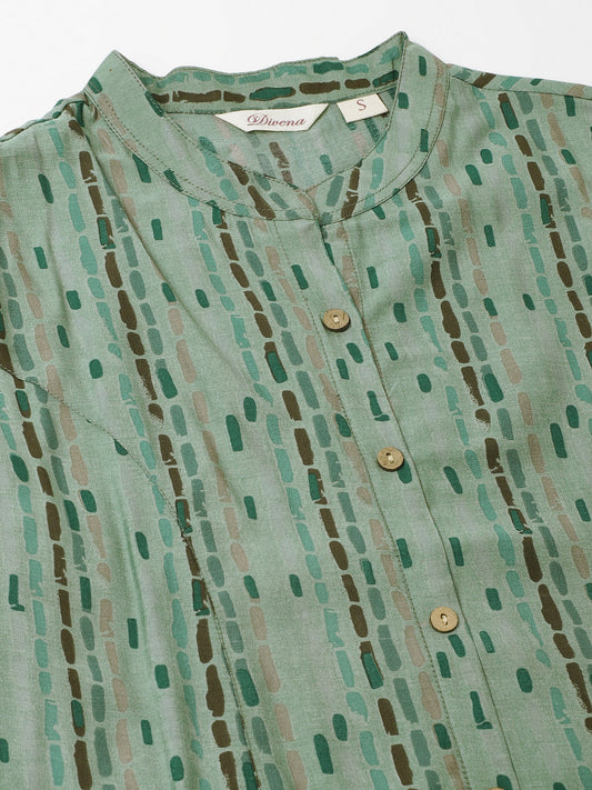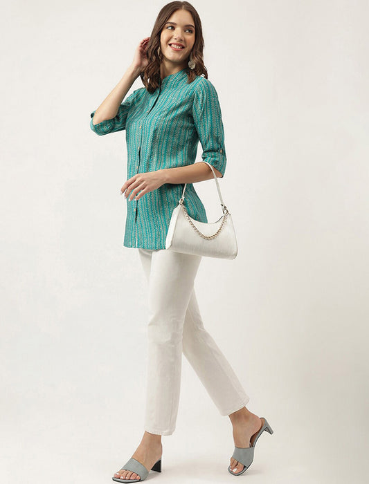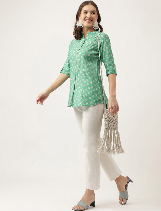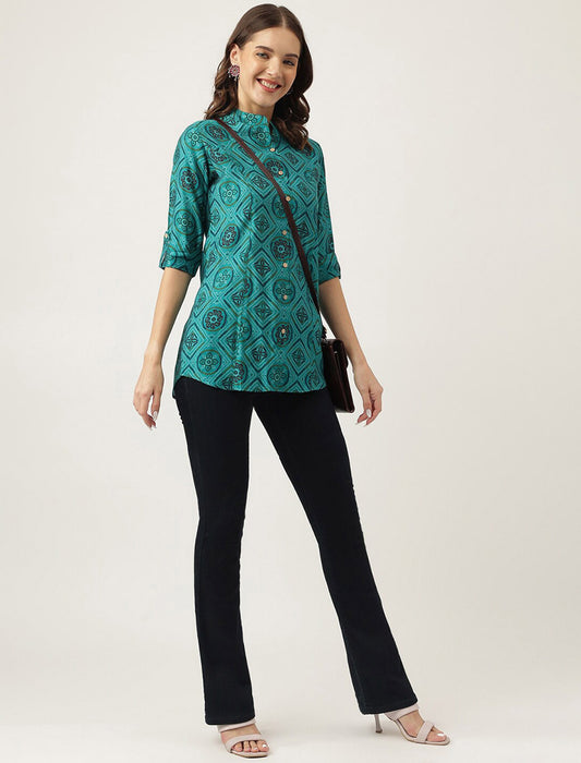 Green Women Ethnic Motifs Printed Mandarin Collar Roll-Up Sleeves Shirt Style Top