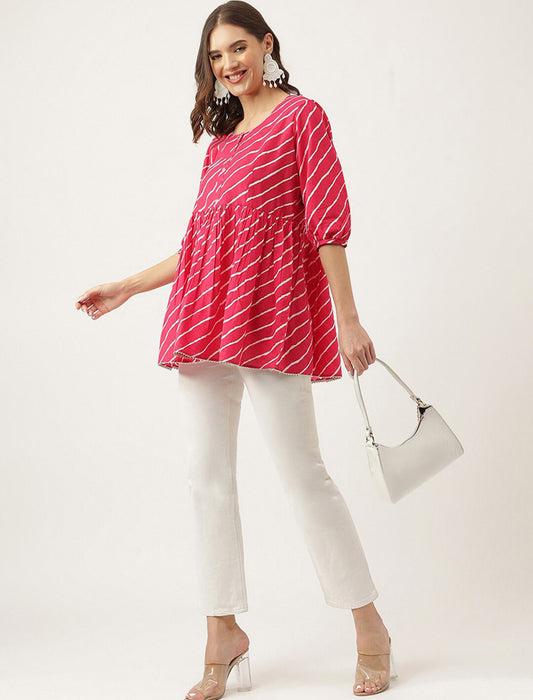 Pink Women Horizontal Striped Gathered Peplum Viscose Rayon Top