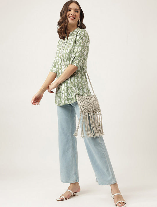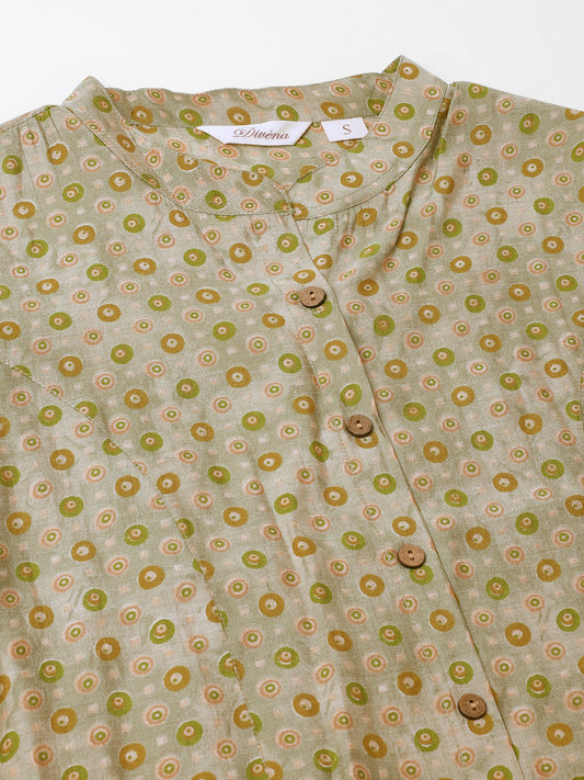 Green & Beige Ethnic Motifs Printed Mandarin Collar Roll-Up Sleeves Shirt Style Top