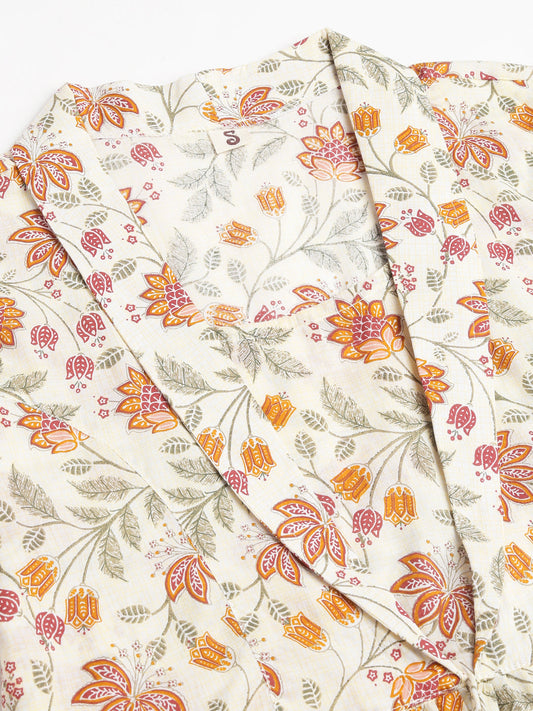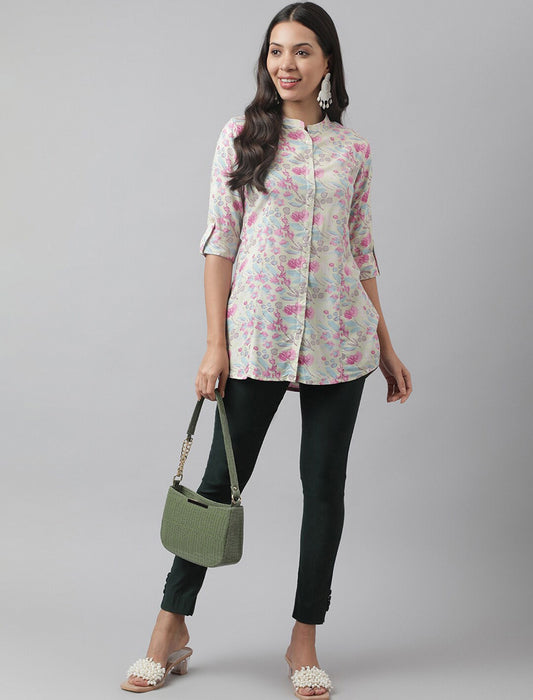 Cream Women Floral Print Mandarin Collar Roll-Up Sleeves A-line Shirt Style Top