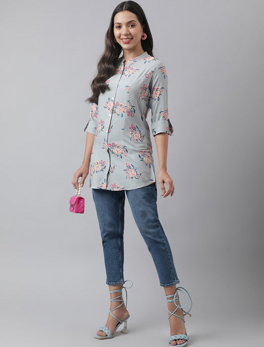 Grey Women Floral Print Mandarin Collar Roll-Up Sleeves A-line Shirt Style Top