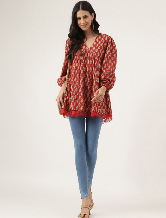 Red Women Floral Ethnic Puff Sleeves Gathered Peplum Top