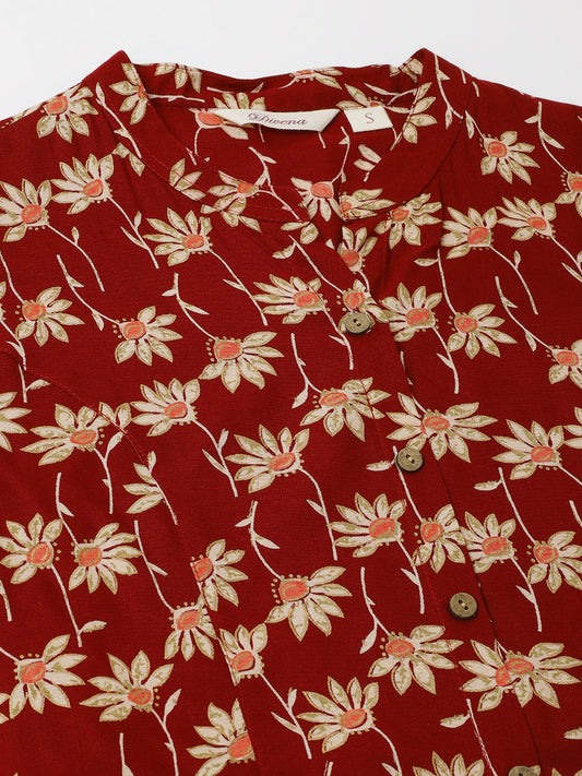 Divena Maroon Floral Printed Rayon Shirt type Top for Women