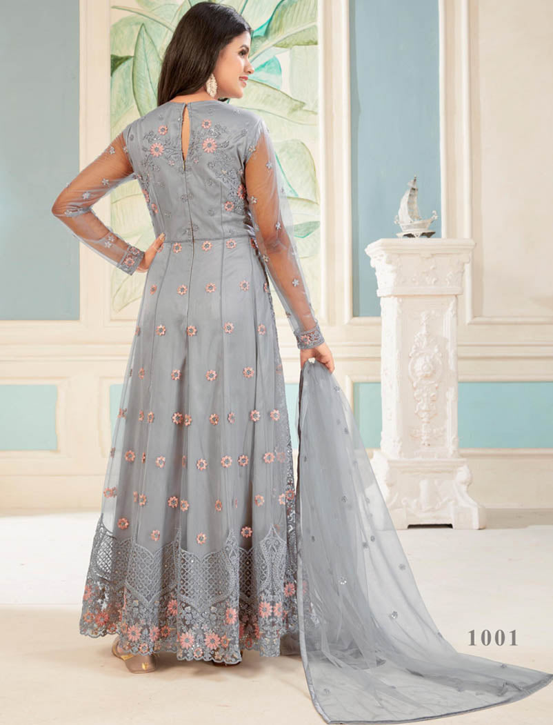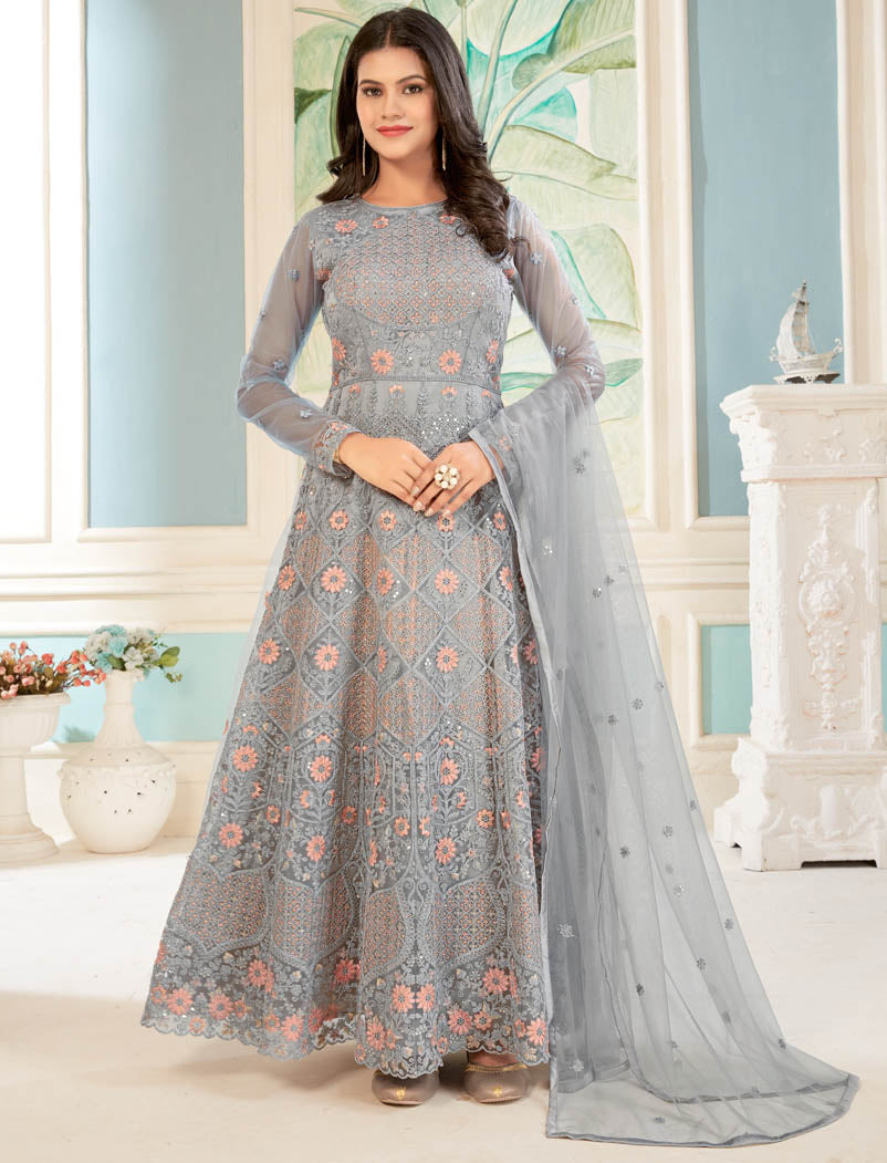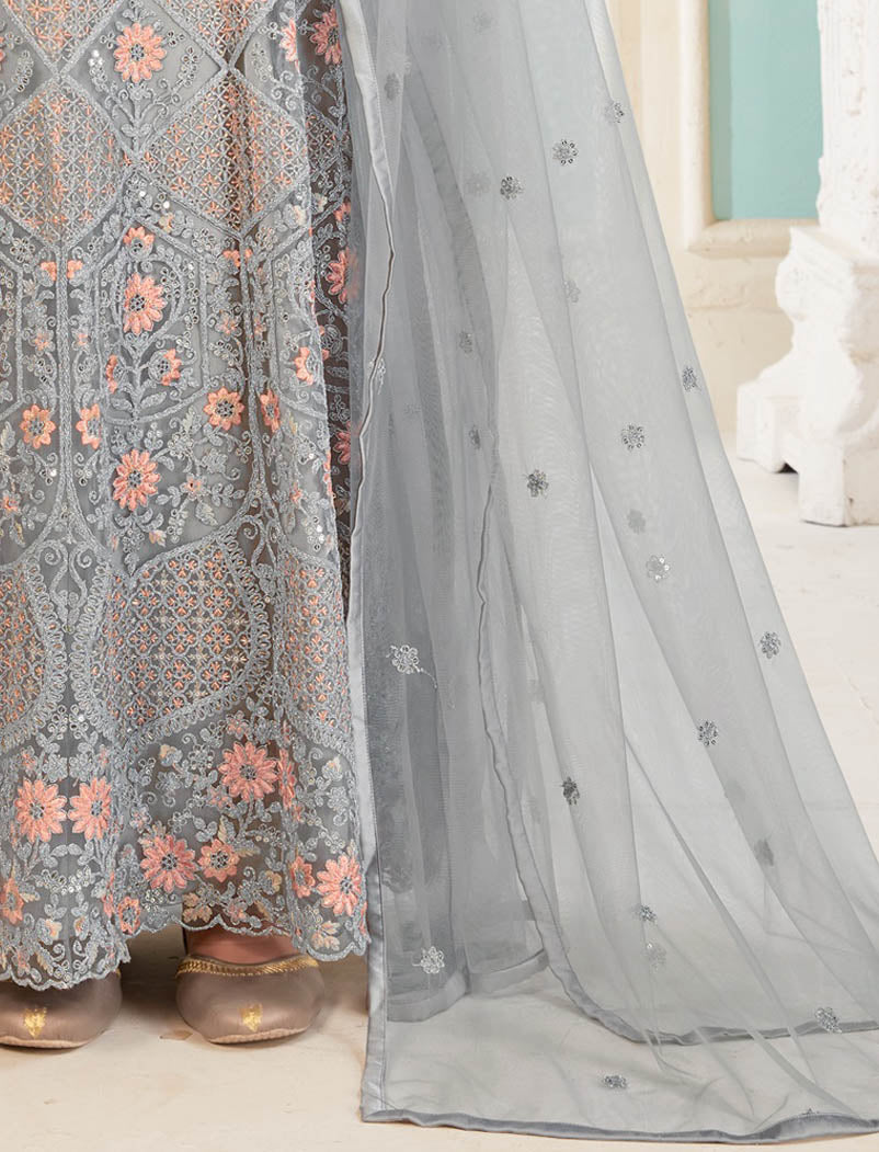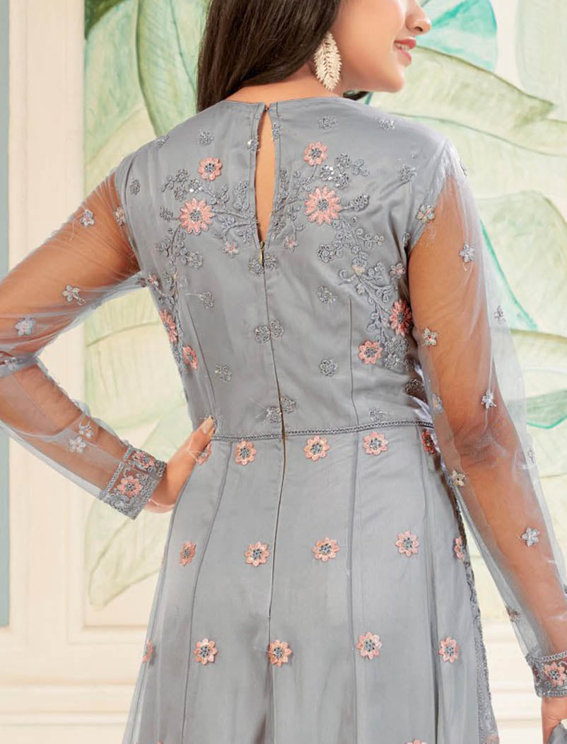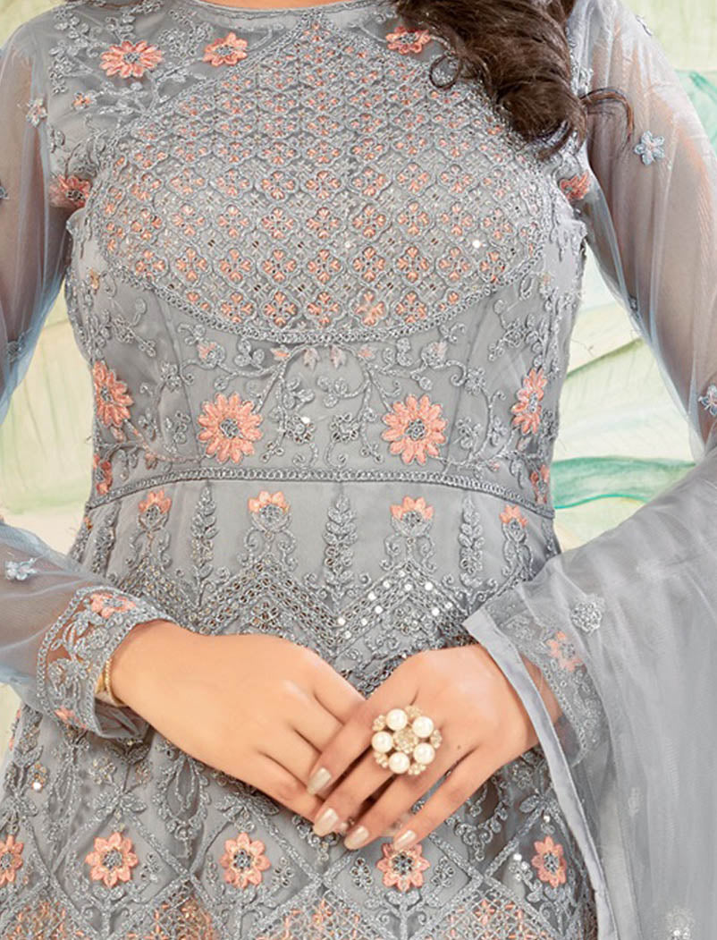 Grey Semi Stitched Designer Work Long Salwar Kameez For Women