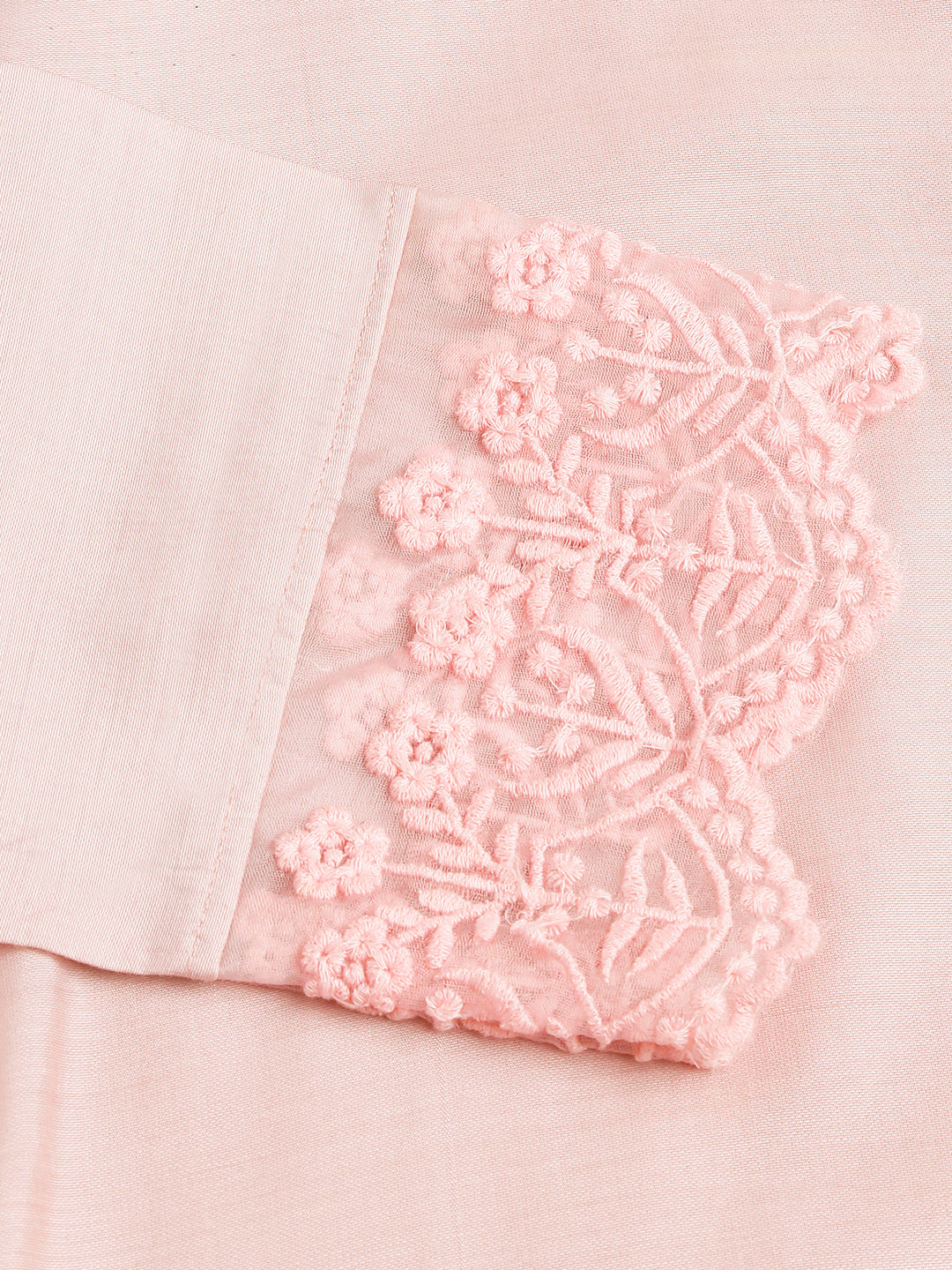 Feel The Wedding & Festive Wibe Of This Baby Pink Solid Chanderi Silk Solid Kurta With Cotton Inner, Pant Set With Organza Dupatta, It Has Round Neck With The Covered With sequin work And Lace border Sleeve. Dupatta Corner Are Coved With Laces. It Has One Side Pocket It Looks Gorgeous For That Exclusive Look Or Just Go Simple And Stunning, Keeping The Look As It Is Your Favorite Colors And You Will Always Look Like And Ethereal Diva In This Ethnic Set.