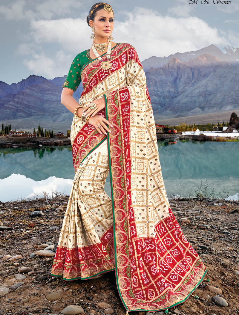 Cream Pure Gajji Bandhej Satin With Italian Silk Blouse Original Mirror Moti & Cut Dana Work Traditional Wear Sarees