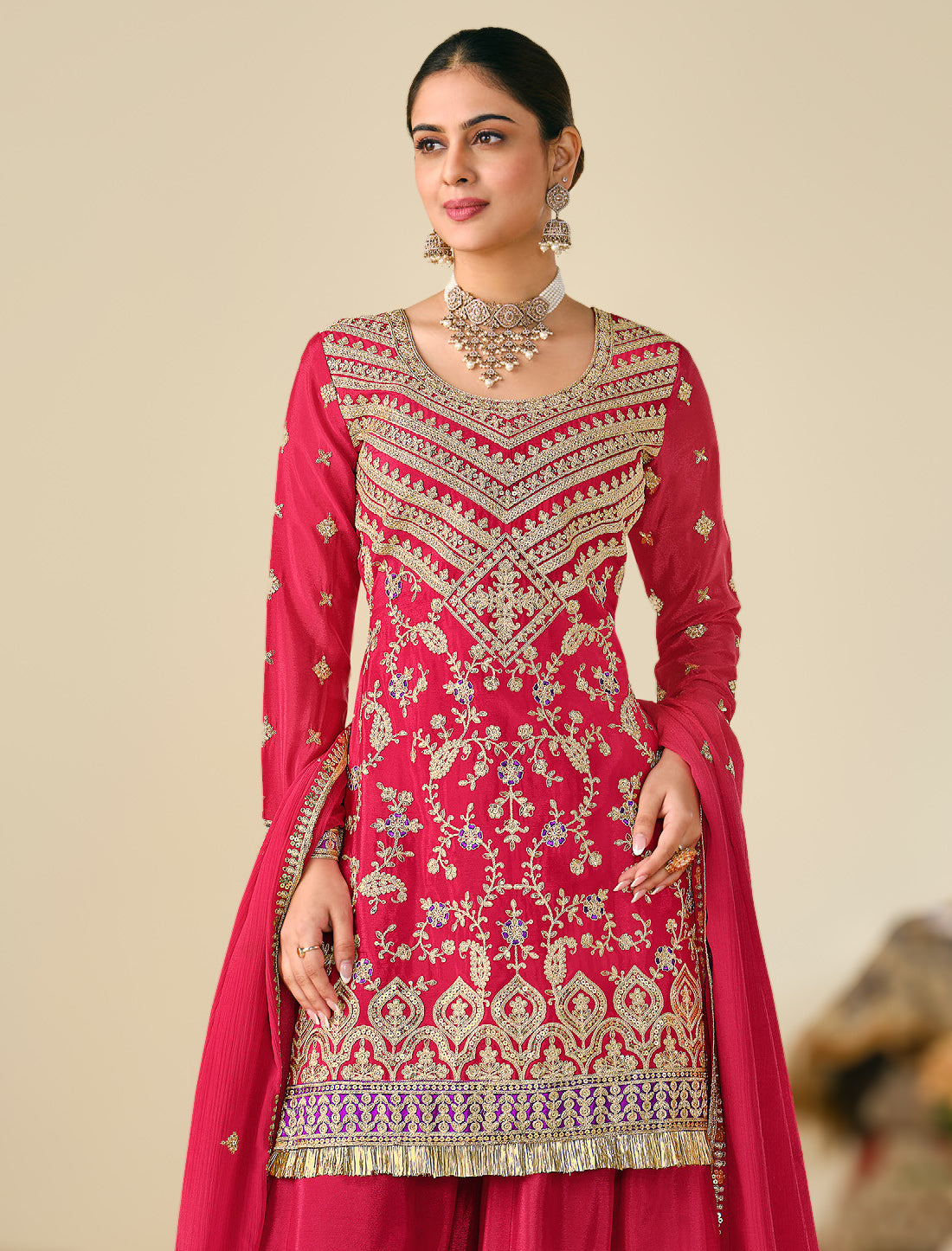 - Bottom: Heavy premium chinon with full flur kali pattern plazo work