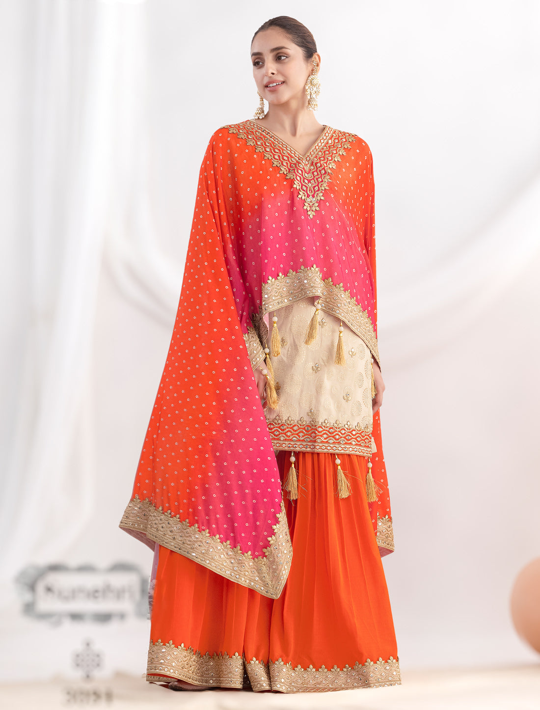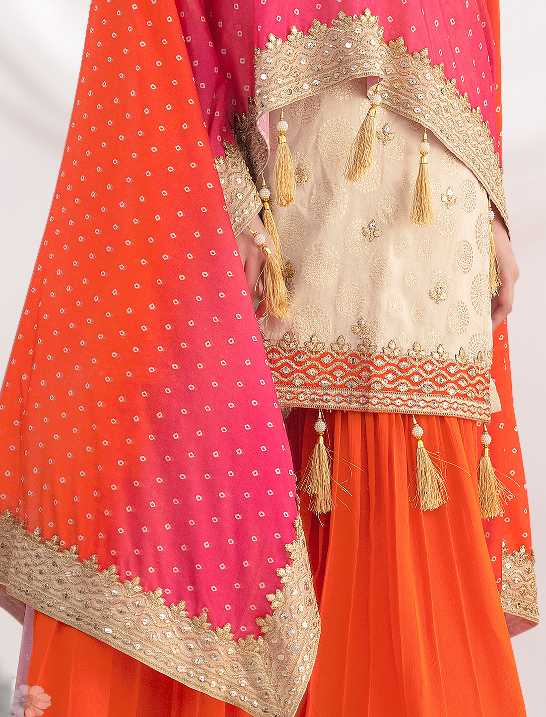 - Bottom: Traditional sharara on premium chinnon fabric with mirror style embroidery and Gota Lace