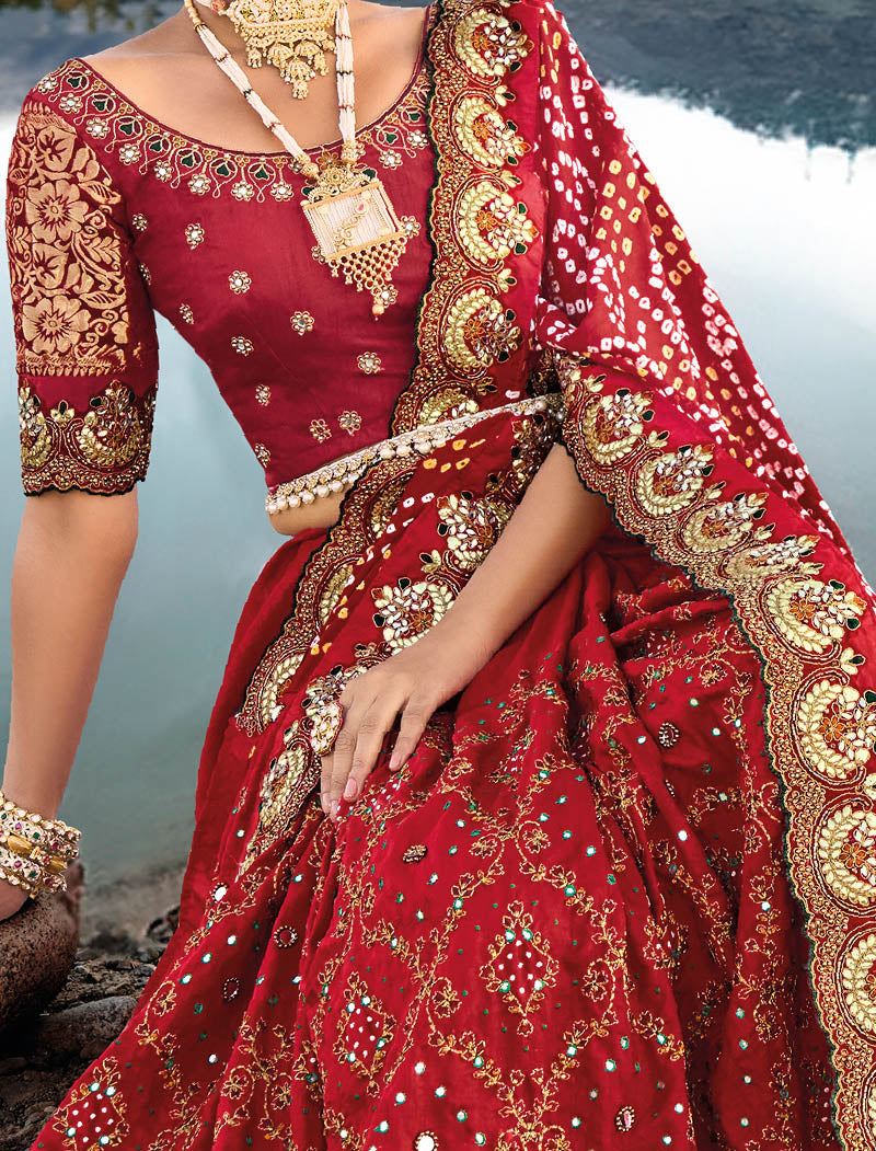 Maroon Pure Gajji Bandhej Satin With Real Silk Blouse Original Mirror Moti & Cut Dana Work Traditional Wear Sarees