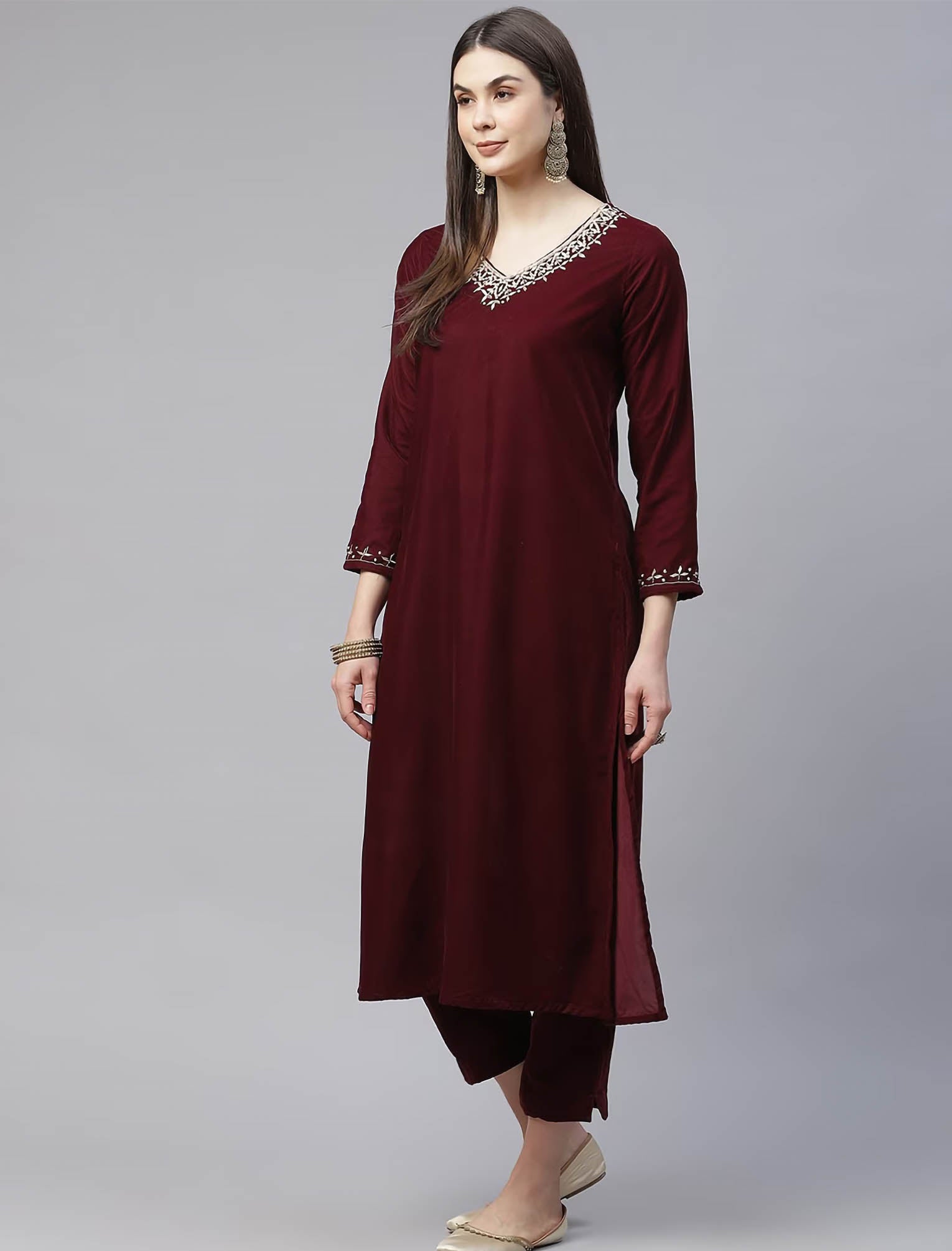 The kurta set for women is maroon, featuring a printed kurta straight shape with regular style. It has three-quarter regular sleeves, trousers has elasticated waist band, round neck, calf length with straight hem. The kurta set is made of weave velvet fabric.