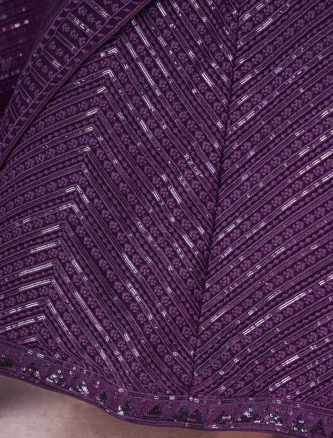 Elevate your wedding ensemble with this exquisite purple designer lehenga choli set from befashionate. Crafted from flowing georgette fabric, the lehenga and blouse offer a comfortable yet elegant fit, customizable up to 42 inches in size. The soft net dupatta adds a delicate touch, adorned with intricate sequins, thread, and zari embroidery that radiate sophistication. Perfect for your special occasion, this unstitched set allows you to tailor your look to perfection, ensuring you stand out with timeless grace.