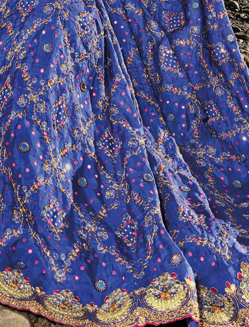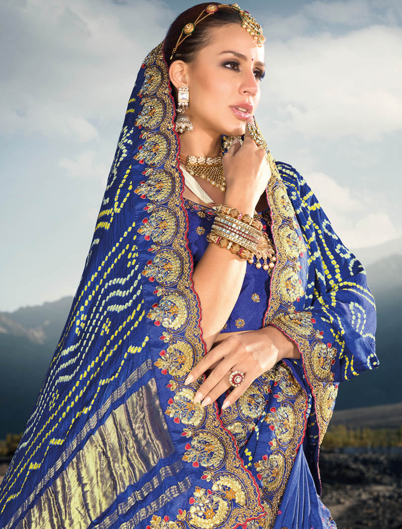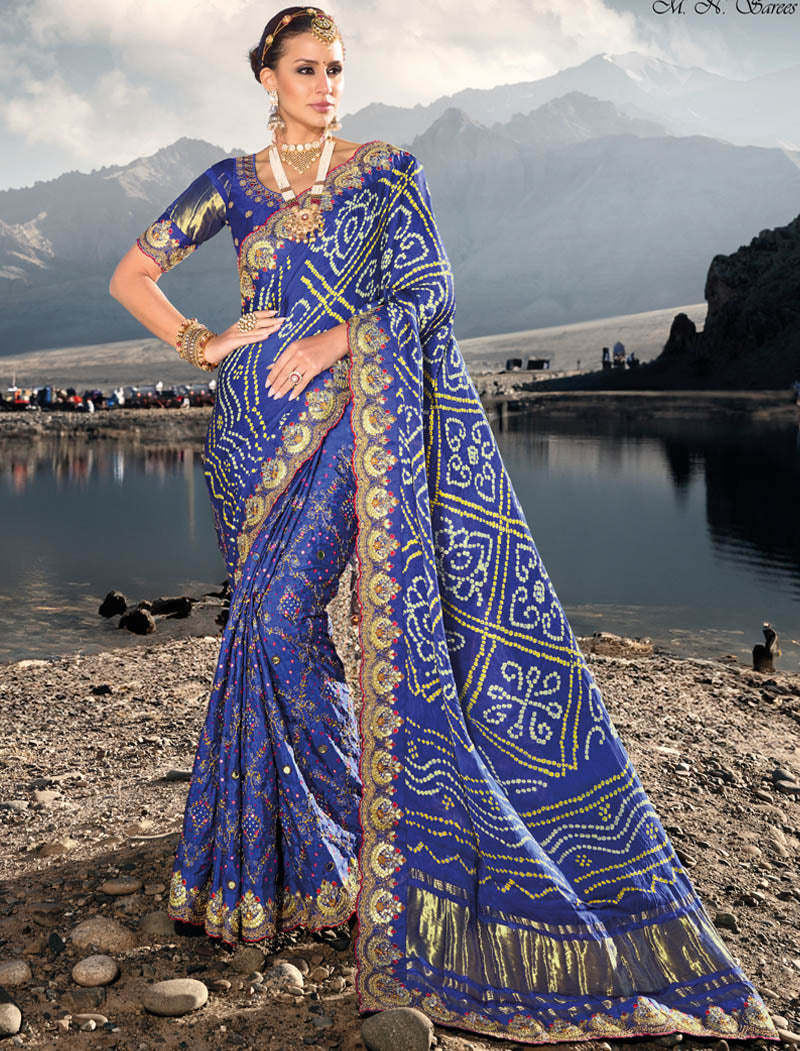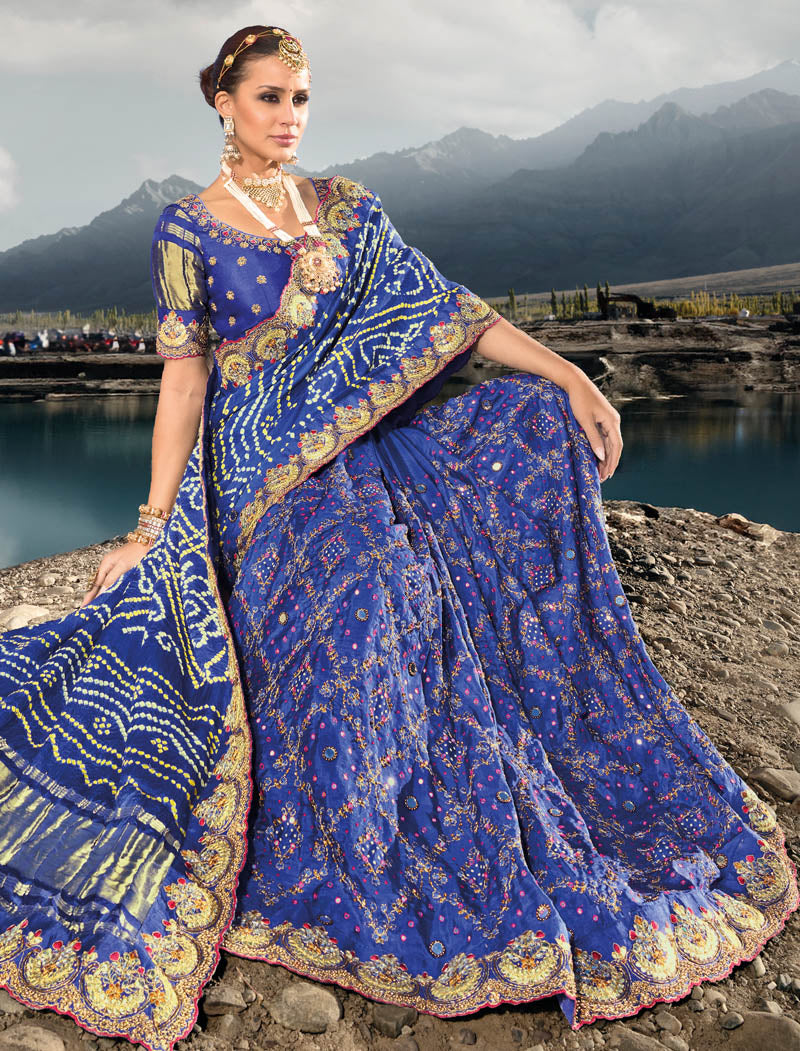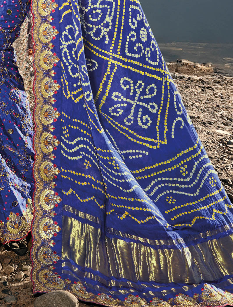 Royal Blue Pure Gajji Bandhej Satin With Real Silk Blouse Original Mirror Moti & Cut Dana Work Traditional Wear Sarees