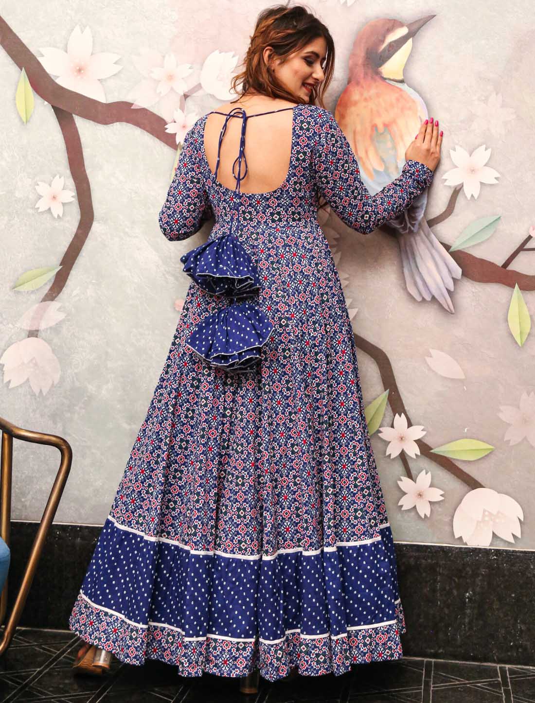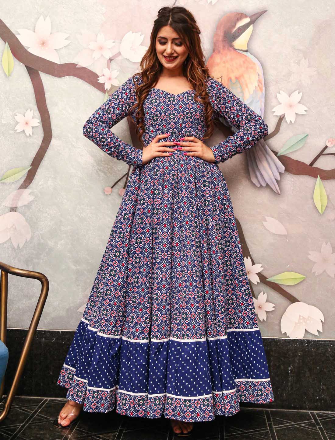 This Western long gown expertly blends comfort and durability through its pure cotton fabric paired with a heavy crepe inner layer. Its detailed heavy digital print work enhances the garment’s sophistication, making it a refined choice for women seeking both style and quality in their attire.