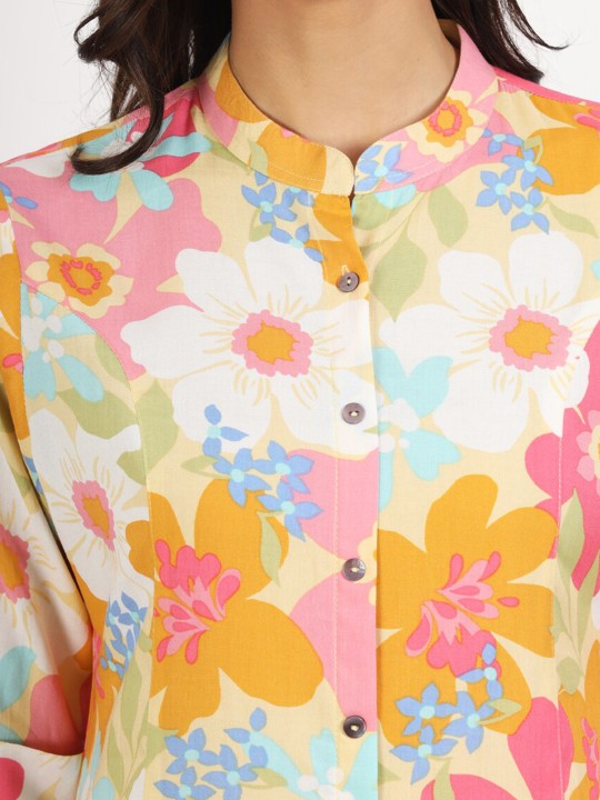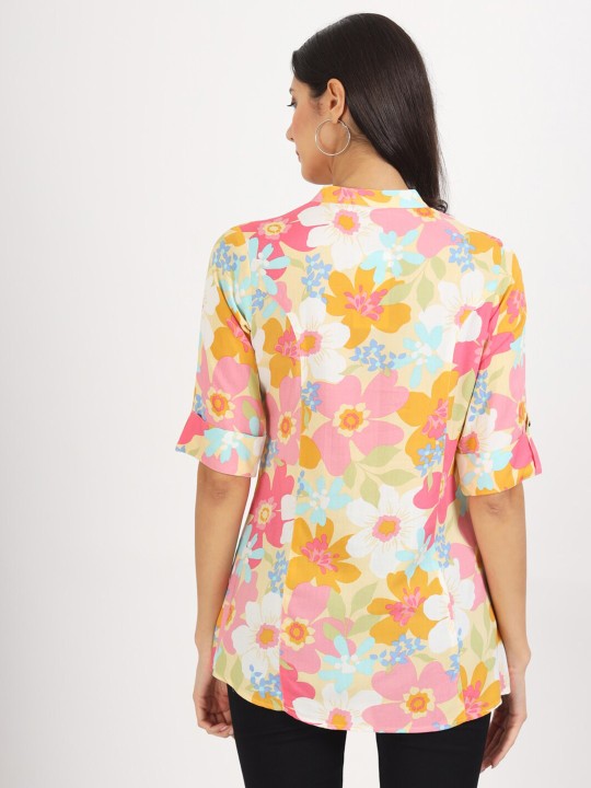 As an expert in the fashion industry, I present to you the Yellow Floral Printed Fold Sleeve Viscose Rayon Casual Top. This beautiful ethnic top is made with soft and comfortable viscose rayon fabric, featuring 3/4th sleeves and a flattering waist length. The top boasts a straight shape and a mandarin collar, making it perfect for casual occasions. Add a touch of elegance to your wardrobe with this top from Befashionate.